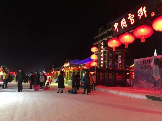 今年雪乡确实没有多少雪,很多人说这是近十年来降雪量最少的一个冬天。但即便如此,此处的雪还是比别处厚实不少。在一些缓坡的屋顶,还能看出往年的模样。四周的山坡被雪覆盖,在夜里也格外清晰。雪韵大街上,一排灯笼把两侧木屋照得通红,食品摊的烤地瓜烤玉米热气腾腾,游人裹在鼓囊囊的衣服中,狗拉爬犁在人群中穿梭,这让我突然有了过年的感觉——虽然我没经历过这样的年。