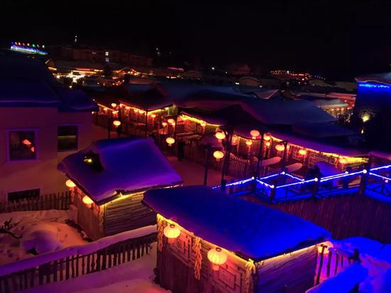 我们的大巴在太阳即将下山的时候到了雪乡的大门。外来车辆一般不得进入景区,乘客们下车,检票,坐摆渡车到雪韵大街时,灯光已经全亮。