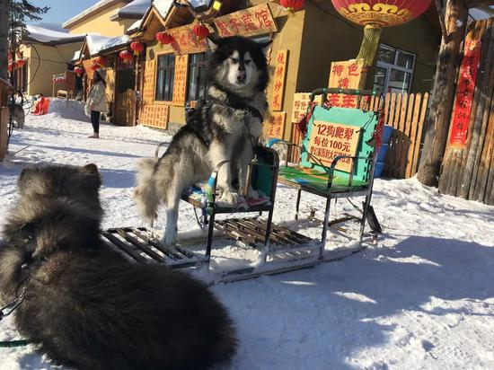 中午很快就到了,这是一天里游客最少的时候。上午的旅游团刚走,下午的又没来,很多小路上空无一人。难得清闲,几只拉爬犁的狗懒洋洋的,快睡着了。在这个时候,雪乡仿佛变回了双峰,只有一些屋子冒着炊烟。