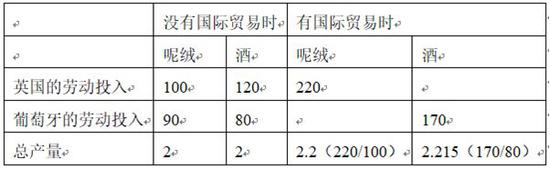 现在让英国和葡萄牙进行分工,各自生产自己具有比较优势的产品,英国生产呢绒而葡萄牙生产酒,英国可以生产出2.2单位的(220/100)呢绒,葡萄牙可以生产2.125单位(170/80)的酒。这样分工生产的结果是两种产品产量都高于分工前。