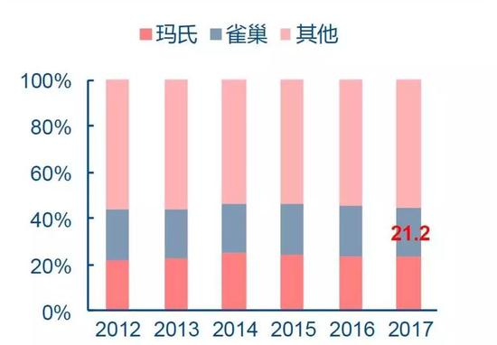 回到国际市场,根据Euromonitor统计,全球宠物市场近半数更是被玛氏、雀巢两大巨头占据,2017年,两家公司市占率分别为23.9%、21.2%。
