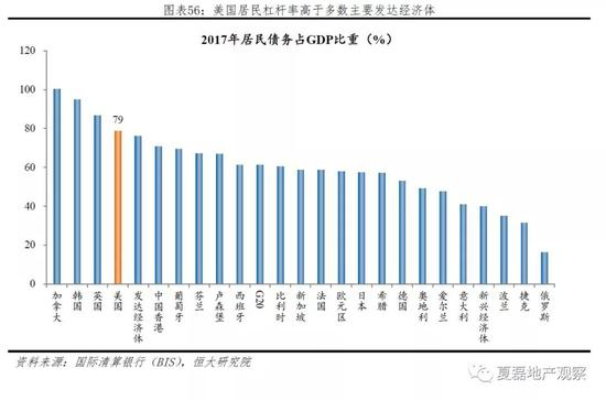 住房市场过度金融化。2017年,新房销售中94%为贷款购买。2005年以来,居民住房贷款存量保持在10万亿美元以上。2017年人均住房贷款余额3.7万美元,全球第一;64%的存量自有住房仍负有抵押贷款;居民债务占GDP比重79%,高于发达经济体平均水平。