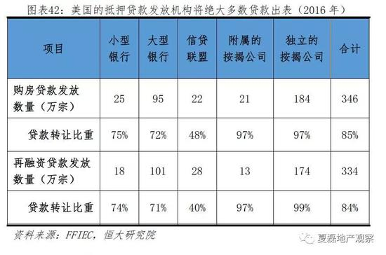 3.1.2 住房金融二级市场:支持抵押贷款发放机构的贷款出表,为一级市场提供流动性资本市场承接一级市场金融机构的抵押贷款出表。金融机构对已发放的抵押贷款有两种处理方式,一种是留在资产负债表内,一种是转售给其他投资者,后者便形成了住房抵押贷款的二级市场。多数贷款机构依赖在二级市场转让贷款以回笼流动性,继续发放新贷款,仅将小部分贷款留在表内。2016年,美国金融机构将85%的新发放贷款转让,独立的按揭公司最为突出,转让了97%的购房贷款和99%的再融资贷款。美国抵押贷款二级市场从大萧条之后开始形成,主要有两方面原因。一是扩充流动性来源。美国的银行在相当一段时期内不能跨州经营,1863年《国民银行法》颁布,规定拥有联邦政府颁发的特许状的国民银行也只能在其所在州开展业务且不可开设分支。即使1927年的《麦克法登法案》,也只是稍作放松,允许国民银行在州内设立分支机构。直到1994年《州际银行和分支机构效率法》(又称《里格尔-尼尔法》)颁布,才放开对银行跨州经营的限制。长期的经营区域的限制约束了银行的负债端扩张和流动性来源。二是解决抵押贷款机构的资金错配问题。从20世纪30年代开始,抵押贷款最长期限延长至30年,而用于放贷的资金却多为短期储蓄,由此导致资产负债期限错配。