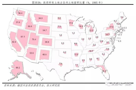 从地理分布上看,私有土地主要位于美国东部和中部,政府所有土地主要位于西部。2015年,在西部11州,联邦政府所拥有的土地面积占比达46.4%,在阿拉斯加占比达61.3%,在其他州则只有4.2%。