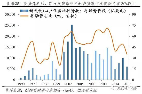 与多元的贷款机构共存的,是多样的贷款用途和贷款产品。除了传统的购房贷款之外,美国家庭还可以申请住房改善贷款或再融资贷款。住房改善贷款,可以用于房屋的改造、更新或修理,即使是简单的屋顶维修、升级节能炉或新增家具,都可以申请。再融资贷款,指借款人申请一笔新的抵押贷款来替代原有的尚未到期的抵押贷款,在美国是与购房贷款同样重要的融资用途。再融资贷款,可以是为了申请更低的利率、更好的付款方式,也可以是由于住房升值而计划从中支取现金。再融资贷款在新发放贷款中的占比,最高时超过70%(2012年),近几年,由于美国货币政策逐渐收紧、开始加息进程,再融资贷款占比有所降低,但仍保持在30%以上。