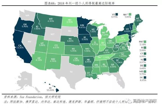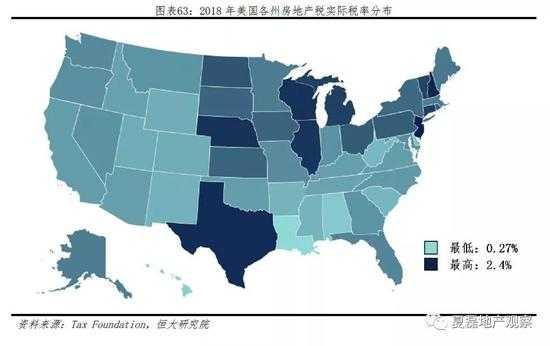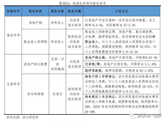 3.3.1 房地产税房地产税在美国属于财产税(Property Tax),征收范围包括土地和房屋,为保有环节税种,归属于州和地方政府。通常由郡政府统一征收,然后划转到相应的政府部门。(1)房地产税的计征房地产税=评估价值×评估率×名义税率。评估环节与征税环节隔离,保证公正性。通常,地方税务部门会设立两个平行的机构——税务评估办公室和税务专员办公室,前者负责每一块不动产的价值评估、后者根据评估价值和减免条款计算应征税额并负责征收,通过隔离评估与征税部门,确保评估的公正性。对每一不动产,会分别评估房产的价值与土地的价值。征收比例与减免政策,各州差异巨大。有些州并不对评估价值进行全额征收,而是有一个评估率,用以调节不同类型房产的实际税率。对于某些主体所持有的不动产,如宗教组织和政府的房产和土地,予以免税。另外,各州也有各自独特的减免政策,如纽约州对老年人、残疾人、退伍军人予以减免。名义税率的确定“以支定收”。州政府通常负责制定房地产税,而将税率、税收减免等权限下放给地方政府。地方政府制定每个年度的预算时,首先确定所需支出和收入,扣除房地产税以外的其他收入后,确定所需房地产税收入,再根据区域内的房地产评估总价值和评估率,确定本年度的名义税率。如果税率有所变化,须经本地居民投票通过后才能执行。通常,房地产税率不会每年都发生变化,居民的税负较为稳定。2018年,各州的房地产税实际税率(以税额占评估价值比例衡量)介于0.27-2.4%。