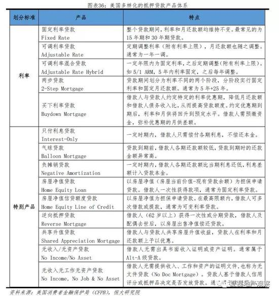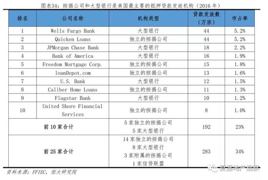 (2)美国的贷款机构多元化、贷款产品多样化美国的抵押贷款机构,以非存款性的按揭公司为主,市场集中度较低。美国的抵押贷款发放机构,主要分为银行、信贷联盟和非存款性的按揭公司三类。其中,独立的按揭公司,以13%的机构数量占比,获得了52%的贷款申请,发放了48%的贷款量,是最主要的抵押贷款机构类型,在2016年美国前25大抵押贷款发放机构中占据14席。大型银行也占据重要地位,11%的机构数占比,发放了31%的抵押贷款。小型银行、信贷联盟、附属的按揭公司,数量众多,但市场份额占比低。一级市场集中度较低,2016年,美国前十大抵押贷款机构共发放了192万宗抵押贷款、市占率仅23%,前25大机构占比也仅34%,43%的机构全年发放贷款数不足100笔,15%的机构不足25笔。