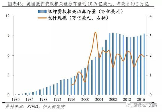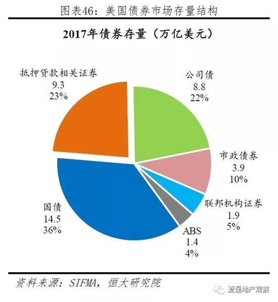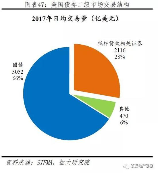 (3)抵押贷款相关证券是美国债券市场第二大类品种抵押贷款相关证券,是仅次于国债的第二大债券品种。2017年,美国债券市场40万亿美元存量,其中抵押贷款相关证券占比达23%,是国债的2/3。债券市场日均交易额7638亿美元,其中抵押贷款相关证券达2116亿,占比达28%,接近国债的一半。