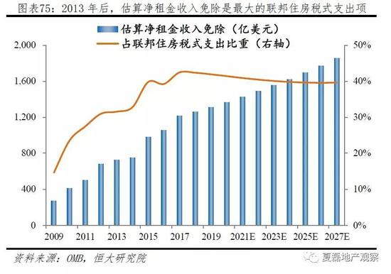 (1)估算净租金收入免除估算净租金收入免除,是在联邦个人所得税应税收入中免除自住住房净租金收入。估算净租金收入=自住住房数量*可比住房市场租赁价格-费用,费用主要包括抵押贷款利息、房地产税、维修费、保险、折旧等。估算净租金收入免除目前是联邦政府的最大住房税式支出项目。 2009-2017年,估算净租金收入免除在联邦住房税式支出中的占比持续提升,自2013年成为最大的项目,2017年占比达42%,超1200亿美元。