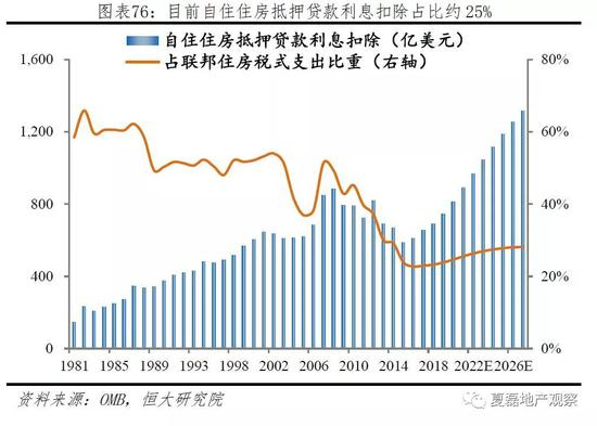 (2)自住住房抵押贷款利息扣除自住住房抵押贷款利息扣除,是从个人所得税应税收入中扣除主要住房和1套第二住房的抵押贷款利息支出。1997-2017年,贷款利息对应的抵押贷款金额上限100万美元。2017年税改法案将对应的上限下调至75万美元。2012年之前,自住住房抵押贷款利息扣除是最大的住房税式支出项目,八十年代占比约60%,九十年代占比50%;次贷危机后下降至2018年的23%,目前是第二大住房税式支出项目。