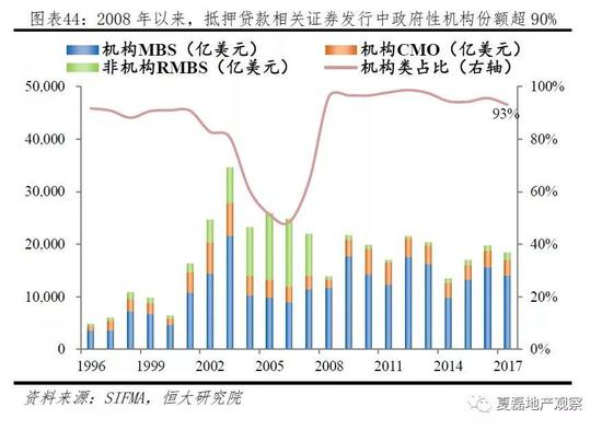 (2)政府赞助企业和政府机构是最主要的抵押贷款资产证券化机构机构MBS是抵押贷款证券市场最主要的类别。由政府赞助企业(GSE,Government-sponsored Enterprise)发行或政府机构担保发行的证券,根据产品分级情况,划分为不分级的机构MBS和分级的机构CMO;其他由私人部门发行的则为非机构MBS或私人标签MBS(Private-label MBS)。2017年,9.3万亿美元抵押贷款相关证券存量中,机构MBS为6.9万亿、占比74%,机构CMO为1.1万亿、占比12%,合计占比96%。2000年以前和次贷危机发生以后,机构MBS和机构CMO在每年住房抵押贷款的资产证券化中占比均超过90%。