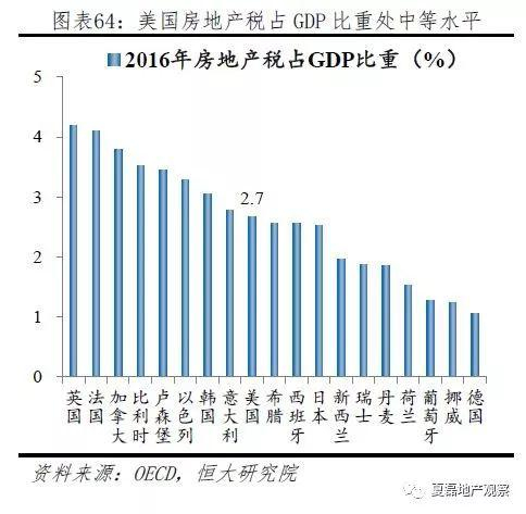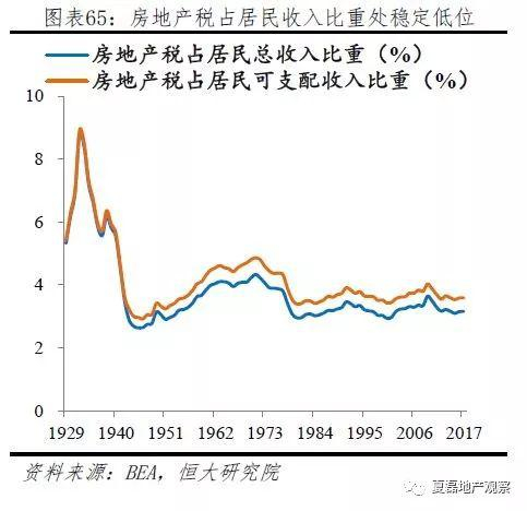 (2)社会成本与收益:居民实际负担较轻、提升房地产价值,对居民房价预期影响不大美国房地产税自殖民地时代既已存在,19世纪末普遍实施、发展成熟。房地产征税起源于殖民地时期,殖民地政府对土地、建筑物、牲畜等课征财产税。在波士顿,教会征收财产税,用于教会费用和宗教教育。1787年美国宪法赋予联邦政府征收直接税的权利,其中包括房地产税。1798年、1814年、1815年、1816年、1861年,联邦政府为应对突发的财政需求,行使了对房地产的直接征税权。多数时期,房地产税征税权由州和地方政府行使。1796年,有四个州以估价的方式对房地产征税。1818年,伊利诺伊州率先实行一般财产税制度,对各类动产、不动产采取统一税率征收。19世纪中期,各州政府陆续对不动产进行征税。到19世纪末,33个州规定了统一财产税条款,规定财产从价计税,以房地产税为主的财产税发展成为州和地方政府的主力税种。美国居民的房地产税实际负担较轻。为了避免房地产税负担过重,各州纷纷规定了一系列针对特定人群的免税、减税、延期纳税和税收抵扣等优惠性措施。为了控制税负的上调,各州还有一系列的税率限制、房地产税收入增速限制、评估价值增长限制等控制性措施。美国房地产税占GDP比重2.7%,在国际主要发达国家中处于中等水平;占家庭收入的比重也稳定于历史低位水平,1980年以来,房地产占居民总收入和可支配收入的比重分别稳定于3.2%和3.6%左右,居民负担不重,又贡献了稳定的税源。