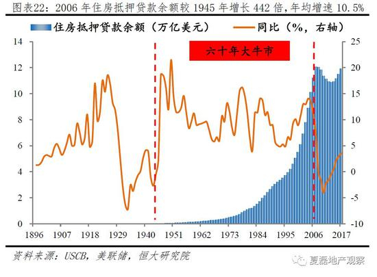 2.2.3 流动性长期充裕,有效满足新增住房信贷需求,助推牛市1944年布雷顿森林体系建立,奠定以美元为中心的国际货币体系,牙买加体系延续美元霸权地位。美国享有向全球征收铸币税的特权,可以输出通胀,因此货币政策长期宽松,住房市场获得充裕流动性,满足人口增长和城镇化创造的住房需求。1946-2006年,M2保持正增长,年均增速6.5%,较1867-1945年高0.6个百分点,与名义GDP增速基本相当,比实际GDP增速高3.4个百分点、较1867-1945年的M2与实际GDP增速差值多1.7个百分点。2006年,居民住房抵押贷款余额较1945年增长442倍至11.24万亿美元,年均增速高达10.5%,远高于1896-1945年4.9%的年均增速。