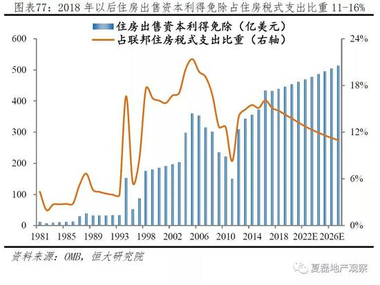 (3)住房出售资本利得免除如果居民在出售住房前的5年内,作为自住主要住房达2年,则最多可免除25万美元联邦资本利得税应税收入,夫妻联合申报为50万美元。该免除每2年至多使用1次。次贷危机之前,住房出售资本利得免除在联邦住房税式支出中的占比一度超过20%(2005年21%),危机后显著下降,2010年以来的比重在15%左右。