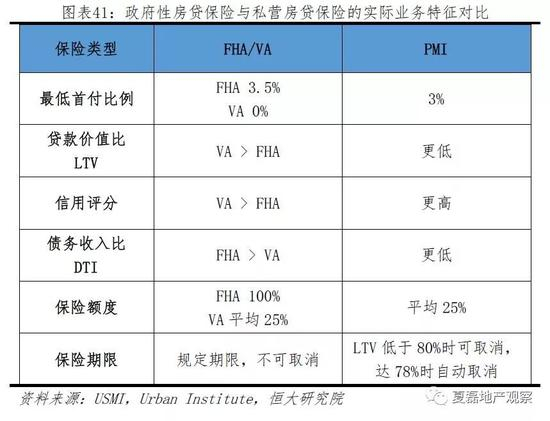 总体而言,FHA、VA等政府机构同PMI相比,具有支持住房自有的公共职能,因此服务范围更广、政策属性更强,对应更低的购房能力、更低的信用门槛和更高的保险保障。2017年,美国居民购房贷款中,非传统贷款的66%发放给了中低收入群体(收入不超过地区中位数的1.2倍),而传统贷款中,这一比例仅有42%。PMI则更显保守,专注于经营贷款价值比(LTV)高于80%部分的风险转移,突出保险属性,当LTV降低到80%时,购房者就可以申请取消PMI、节省保费,当降至78%时自动取消。