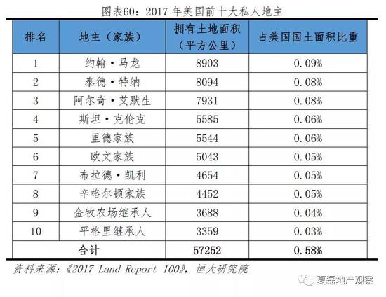 3.2.2 土地流转制度:自由买卖或出租美国所有土地都实行有偿使用,土地可以买卖或出租。政府为了公共利益需要占用其他公共土地或私人所有土地,须经规划许可,且必须按照市场价格购买、对等交换或捐赠等方式来取得土地。通讯、输电等管线要通过公有土地,必须向土地管理局通行权处申请批准,并支付租金。拥有土地所有权的私人或政府可自行或通过中介出租土地。出租方式有固定出租(法律固定年限,当事人无权修改)和浮动出租(出租年限由当事人协商决定),但交易价格由市场和双方协商决定。自由的土地市场,造就了美国独特的“超级大地主”现象。2017年美国前十大地主及其家族,持有土地5.7万平方公里,占美国国土面积的0.58%,占私人所有土地的1%。