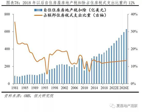 3.3.5 税收优惠:联邦住房税式支出联邦政府通过直接支出和税式支出两种方式支持住房产业活动。税式支出(Tax Expenditure)是指由于根据联邦税法对个人或公司总所得实施特定的免除、豁免、扣除条款或提供特定的税收抵免、税率优惠、税收递延,而造成的税收损失。联邦政府的住房相关税式支出规模远大于直接支出,2018年近3000亿美元,占联邦财政收入9%。美国住房税式支出的主要目标是促进住房自有。目前美国住房相关税式支出共十类,其中估算净租金收入免除、自住住房抵押贷款利息扣除、住房出售资本利得免除、自住住房房地产税扣除四项占比超90%,适用条件均是自住住房。2018年,估算净租金收入免除在住房税式支出中占比最高,达42%,其次是自住住房抵押贷款利息扣除、住房出售资本利得免除、自住住房房地产税扣除,分别占比23%、15%、12%。