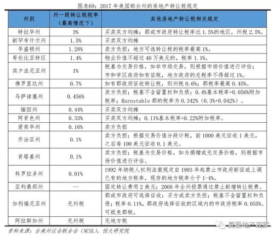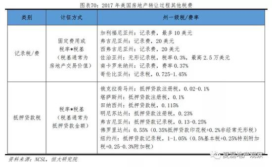 3.3.3 房地产转让税费房地产转让税费,是政府对房地产交易的产权转让而征取的税收及费用,主要包括房地产转让税、记录税(费)、抵押贷款税等各类项目,向买卖一方或双方共同征收,在转让过户时一次性缴纳。房地产转让税费归属于州和地方政府。各州对房地产交易税费有独立立法权,自主决定是否征收、税费种类、税率费率、征收主体等项目。美国各州中,有12个州不征收房地产转让税费,17个州只征收州一级税费,2个州只征收地方政府一级税费,19个州同时征收州和地方政府税费,华盛顿哥伦比亚特区也有征收。房地产转让税(Transfer Tax)是最常见最主要的转让税种,35个州和华盛顿哥伦比亚特区都有征收,部分地区使用印花税(Stamp Tax)、契税(Deed Tax)、过户税/费(Conveyance Tax/Fee)或消费税(Excise Tax)等名目。除了亚利桑那州固定收取2美元转让费之外,各州多以房地产交易价格为税基,州一级税率从科罗拉多州的0.01%到特拉华州的3%不等,多由卖方负担或买卖双方均摊。房地产转让税在财政收入中占比较低,如新罕布什尔州和宾夕法尼亚州,州房地产转让税率分别为1.5%和1%、在各州中处于中等偏高水平,而房地产转让税收入占州政府财政收入的比重分别约为1%和0.7%、占税收收入的比重分别约为2%和1.5%。