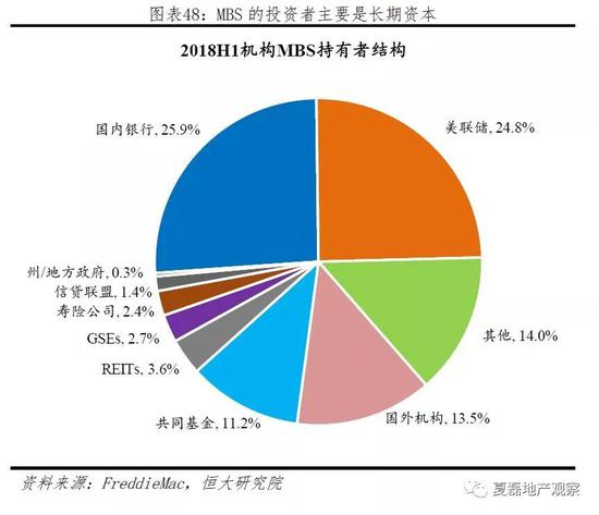 抵押贷款相关证券面向资本市场,持有者以长期资本为主。截至2018年上半年,7万亿美元机构MBS存量中,美联储、GSEs、州和地方政府等政府部门或机构合共持有约30%、国内银行共持有26%、共同基金持有11%。资本市场的参与,为贷款机构提供了巨量与房贷久期相匹配的长期资金。