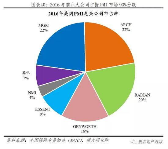 私营房贷保险机构形成重要补充,提高了市场竞争度与多样性。 1957年,在FHA已经运营超过20年的背景下,第一家私营房贷保险公司MGIC成立,为购房者提供了更丰富的选择。与政府机构相比,私营公司效率更高,PMI保险存量规模迅速从1960年的3亿美元激增至七十年代末的630亿美元,次贷危机前夕,PMI在房贷保险市场的占有率一度达到3/4(2007年)。目前,PMI市场集中于六家龙头公司,占比超过90%。