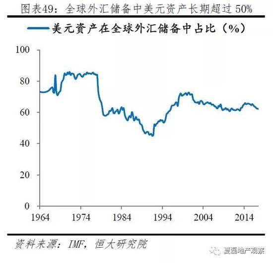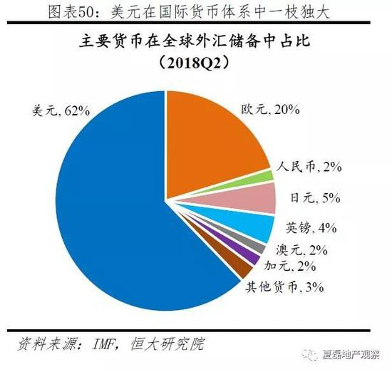3.1.3 美元的霸权地位为住房金融化背书美元至今仍是全球最重要的储备货币。布雷顿森林体系奠定了美国的国际货币地位,七十年代,美元资产在全球外汇储备中占比超过80%。1971年8月15日,尼克松总统取消美元与黄金的自由兑换,宣告布雷顿森林体系解体。同年12月18日,主要发达国家达成史密森协定,同意美国放弃兑换黄金的义务、美元贬值、扩大各国货币与美元之间的汇率波动幅度,但史密森协定不能约束美国从国内利益出发、奉行扩张性的货币政策,1973年,美元大幅贬值,史密森协定宣告失败。1976年,牙买加体系成为新的国际货币体系,但美元仍保持着在国际储备货币中的霸权地位。牙买加体系推行黄金非货币化,认可了各国自主的汇率安排,承认了浮动汇率制的合法性。尽管各国拥有汇率制度自主权、欧洲转向在美元体系之外建立欧洲货币体系,但多数经济体仍以美元为主要的货币锚,采取货币局、钉住、爬行钉住等固定汇率制度,使得美元仍旧保有主导地位。截至2018年二季度,美元资产在全球外汇储备中占比仍超过60%,2016年10月1日开始生效的最新SDR货币篮子中,美元占比41.73%。美元在国际货币体系中的霸权地位,导致美国的货币政策总是倾向于过度宽松、财政政策过于积极,鼓励美国家庭过度消费、过度借贷。由于牙买加体系对储备货币发行缺少约束,美国作为最主要的储备货币发行国,享有铸币税特权,可以通过发行美元为政府债务赤字和经常项目逆差(“双赤字”)融资,流动性过剩和通胀压力则被全球其他经济体所吸收。