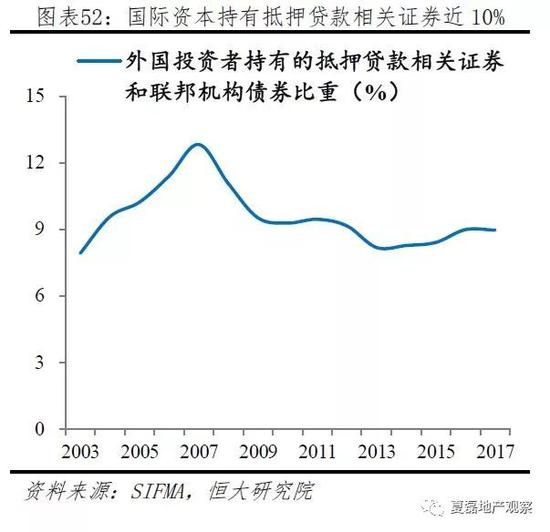 美元证券资产成为国际投资者资产组合的重要投资标的。截至2017年,外国投资者共持有美股7.1万亿美元、国债6.3万亿、公司债3.9万亿、MBS和联邦机构债券1万亿,合计18.3万亿,占美国GDP比重近100%。美国抵押贷款相关证券持有者中,外国投资者占比保持在10%左右,成为美国抵押贷款的重要资金来源,国际资本为美国居民的住房消费做出重要贡献。