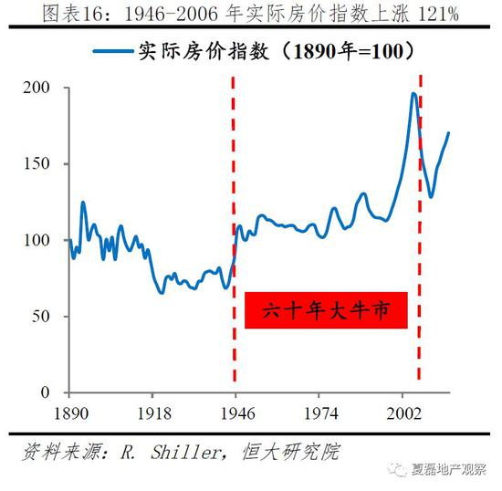 1890年以来,美国房价总体呈现上涨趋势,至2017年,名义房价指数上涨累计54倍,实际房价指数累计上涨70%。其中,二战结束至次贷危机前夕,美国房地产市场经历了长达60年的大牛市:2006年,名义房价指数较1946年上涨24倍、实际房价指数上涨121%。