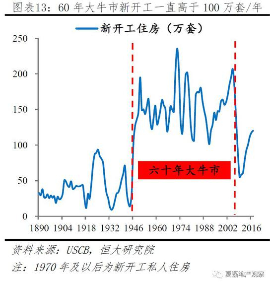 二战结束至次贷危机前夕,美国房地产市场经历了长达60年的大牛市。1946-2006年,住房新开工保持在100万套/年以上,年均153万套;名义房价指数持续正增长,累计上涨24倍、年均增速5.4%,实际房价指数累计上涨121%,核心城市的房价涨幅更高,是跑赢印钞机的少数资产之一;住房自有率从1940年的44%提高至2006年的69%。