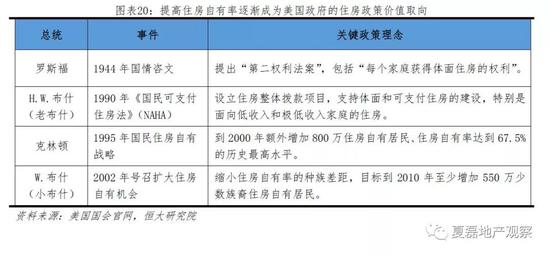 大萧条之后,美国开启政府干预住房领域历史,罗斯福总统提出“每个家庭获得体面住房的权利”;九十年代以后,老布什、克林顿、小布什三位总统以提高住房自有率为住房战略,特别是提高中低收入和少数族裔家庭的住房自有率。