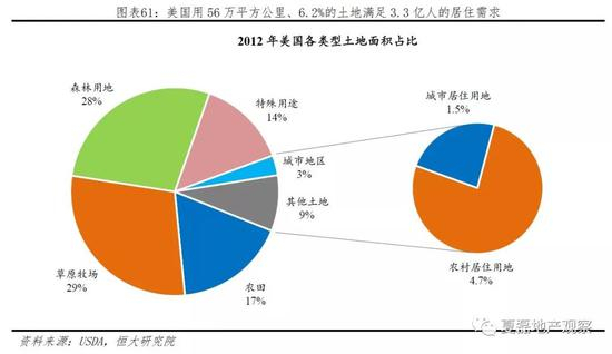 重视农地保护。20世纪30年代以后,美国的土地制度已基本形成并进入成熟稳定的发展阶段,但是大量的开垦使美国的土地资源遭到严重破坏。之后的几十年,美国的土地制度建设重点转移到对土地资源的保护。1981年《农用土地保护法》出台,严格控制将农用土地转为非农用地,1996年《联邦农业发展与改革法》出台,制定了保护备用地计划。2000年实施的《农业风险保护法》进一步限制了对农用地的非农化使用。3.2.4 当前的用地结构:居住用地充足地广人稀,居住用地充足。美国916万平方公里土地面积,以农林牧用地为主,农田、牧场、森林用地占比分别17%、29%和28%。居住用地共56万平方公里,其中1/4为城市居住用地、3/4为农村居住用地,占国土面积比重达6.2%,对应于3.3亿人的居住需求,人均居住用地面积高达1728平。