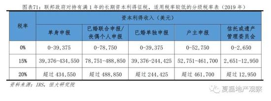 3.3.4 资本利得税资本利得税,是政府对不动产交易所产生的收益进行征税,为交易环节税种,归属包括联邦政府、大多数州政府及少数地方政府。(1)资本利得税的计征资本利得税的税基是房地产出售时所获差价扣除基本费用后的收入净额,基本费用包括转让税费、维修费、法律费等。税率采用超额累进制。为抑制短期投机、鼓励长期投资,税率依据持有年限有所差别。持有不到1年的短期资本利得税税率较高,适用个人所得税分级税率,其中联邦税率10-37%、共分7档。持有满1年的长期资本利得税税率较低,其中联邦税率介于0-20%,共分3档;2018年,美国各州的联邦和州的长期资本利得加总的最高档税率介于20-40%,其中9个州免征州级资本利得税,15个州在计征州资本利得税时允许税前扣除联邦资本利得税、或设有地方政府一级资本利得税、或对资本利得收入有特殊的税收安排。