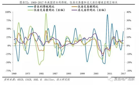 尽管美国资本利得税重在抑制住房投机,特别是短期投机行为,但实际效果有限。一是税收波动显著,次贷危机前资本利得税的波动浮动基本在-50%至50%之间,表明住房投机活动存在周期性活跃和冷却现象。二是税收波动比住房交易额更大,在住房交易额显著增长或减少的时期,资本利得税的变化程度更大,表明住房交易活跃时期投机行为更为活跃,并未受到有效抑制。三是税收波动与交易量、房价的波动基本同步,但交易量变化最为领先,房价变动居中,税收最为滞后,一方面是由于税收计征的滞后性,另一方面,也反映即使有资本利得税的负向激励,但住房市场的活跃仍能显著激发投机行为。