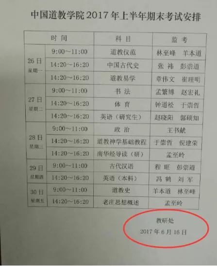 从2017年的考试安排上还能看到教研处的落款,可见道观对学习的重视。