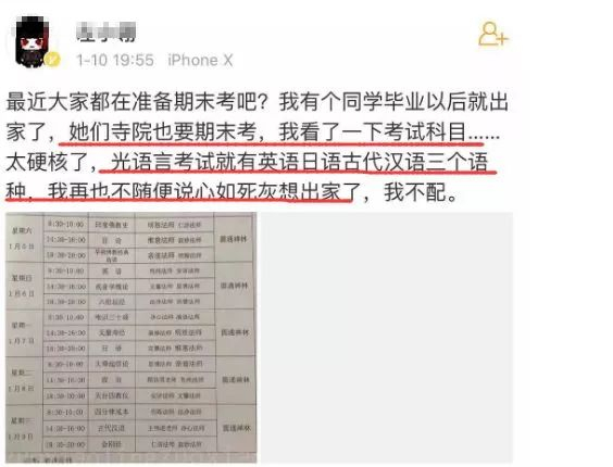 此前,有人就晒出了某寺院的期末考试安排,单单语言考试就有英语、日语、古代汉语三门。