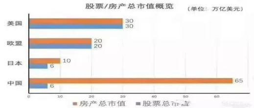 去年财新峰会上,SOHO中国董事长、联合创始人潘石屹说,“据最新数据显示,房子的价值达到了65万亿美元。这超过了美国、欧盟加上日本三个地方的数”。网上也流传着一张配套的图表。