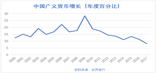 用广义货币(对应的官方统计口径是M2)增速来看,中国的货币增速比经济增速更加猛烈。据世界银行的数据,2000年至2017年中国的广义货币增加了13.84倍,以至于全世界的经济学家都曾好奇中国如此高的货币增速为何没有导致恶性通货膨胀,即超发的货币去哪里了?依我看,相当一部分货币去了房地产里。
