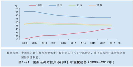 与此相对比,过去10年间其他主要经济体的住户部门都经历了不同程度的去杠杆(见下图)。例如,美国住户部门杠杆率从2008年末的95.4%显著降至2017年末的78.7%,同期日本住户部门杠杆率从59.5%降至57.4%,欧盟从60.4%降至58.0%。