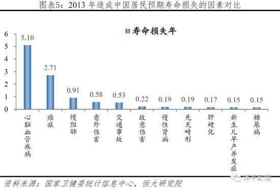 统计数据显示,心脑血管疾病和癌症在我国居民的死因构成中占比约70%,合计造成寿命损失7.8岁,是我国居民寿命的最大杀手。此外,慢阻肺、慢性肾病、肝硬化、糖尿病等慢性病造成寿命损失1.4岁,意外伤害、交通事故及故意伤害共造成寿命损失1.3岁。