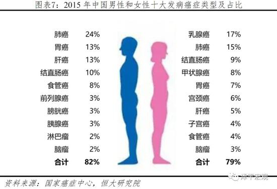 2015年我国癌症发病390万,死亡230万,男性分别占55%和63%,均明显多于女性。同时癌症类型较为集中,男性主要为肺癌、胃癌、肝癌等类型,女性主要为乳腺癌、肺癌、结直肠癌等类型,前十大癌症类型约占发病总数的80%。