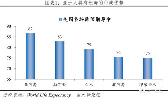 在全球各个种族中,亚洲人具有长寿的基因优势。2016年美国亚洲裔的平均预期寿命达87岁,高出白人8岁,在美国各族裔中最高,显示出亚洲人在长寿方面的基因优势。