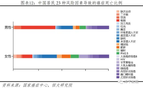 分人群来看,对中国男性而言,戒烟、接种乙肝疫苗、增加水果摄入是有效的防癌措施,其中戒烟尤为重要;对中国女性而言,增加水果摄入、接种乙肝疫苗、戒烟、接种HPV疫苗和减肥是可行的防癌措施。根据国家癌症中心的数据,我国居民的癌症死亡可归因23种因素,其中男性主要归因于吸烟、乙型肝炎病毒感染和水果摄入不足,且吸烟占比最高,女性主要归因于水果摄入不足、乙型肝炎病毒感染、吸烟、人乳头瘤病毒感染、肥胖和PM2.5。