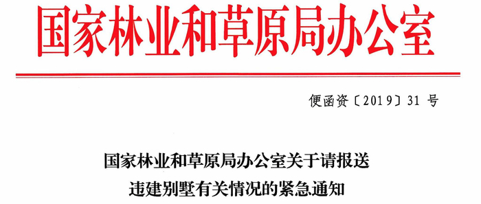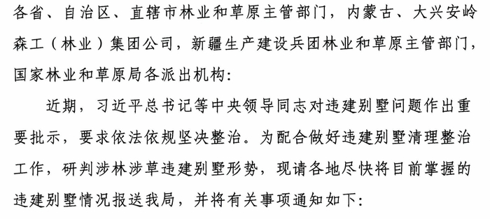 除了住建部,国家林业和草原局亦发布《关于请报送违建别墅有关情况的紧急通知》。
