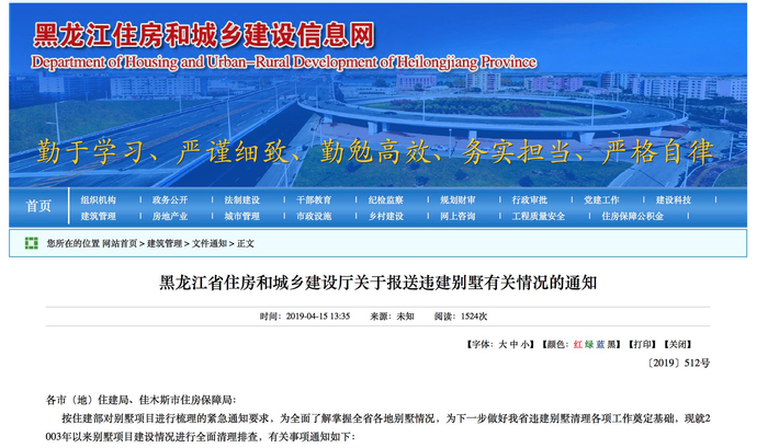 在此之前,4月15日,黑龙江省住房和城乡建设厅发布《关于报送违建别墅有关情况的通知》,《通知》称,按住建部对别墅项目进行梳理的紧急通知要求,为全面了解掌握全省各地别墅情况,为下一步做好我省违建别墅清理各项工作奠定基础,现就2003年以来别墅项目建设情况进行全面清理排查。