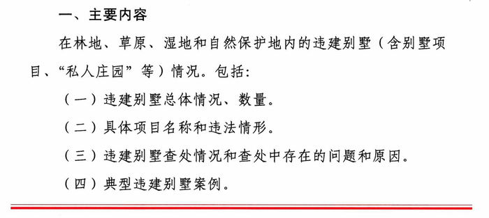 《通知》明确,在林地、草原、湿地和自然保护地内的违建别墅(含别墅项目、“私人庄园”等)情况,包括:违建别墅总体情况、数量;具体项目名称和违法情形;违建别墅查处情况和查处中存在的问题和原因;典型违建别墅案例。违建原因包括:没有任何审批手续的违建别墅;虽有相关审批手续,但应当经林业和草原主管部门审核同意而未审核的违建别墅;以其它名义取得林业和草原部门审核同意,但改变建设用途的违建别墅。