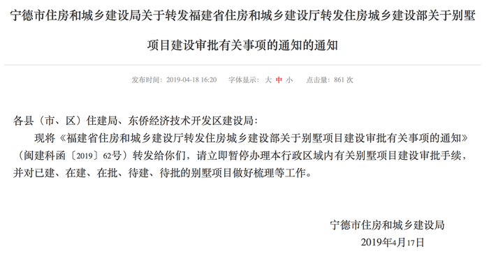 4月17日,宁德市住房和城乡建设局网站显示,福建省住房和城乡建设厅转发《住房城乡建设部关于别墅项目建设审批有关事项的通知的通知》(建科函[2019]57号),《通知》要求,立即暂停办理本行政区域内有关别墅项目建设审批手续,对已建、在建、在批、待批的别墅项目做好梳理等工作。