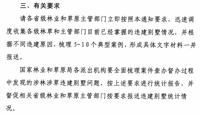 国家林业和草原局要求各省级林业和草原主管部门立即按照《通知》要求,迅速调度收集各级林草和主管部门目前已经掌握的违建别墅情况,并根据不同违建原因,梳理5-10个典型案例,形成具体文字材料一并报送。