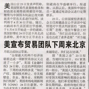 彭博社称,最近几周,美中双方加强了外交努力,试图解决长达一年的贸易争端, 官员们正努力争取两国领导人面对面会谈并签署协议。3月28日至29日,第八轮中美经贸高息别磋商在北京举行; 4月3日至5日,第九轮中美经贸高级别磋商在华盛顿举行。报道称,从那以后,美国和中国官员一 直通过电话会议进行定期联系。