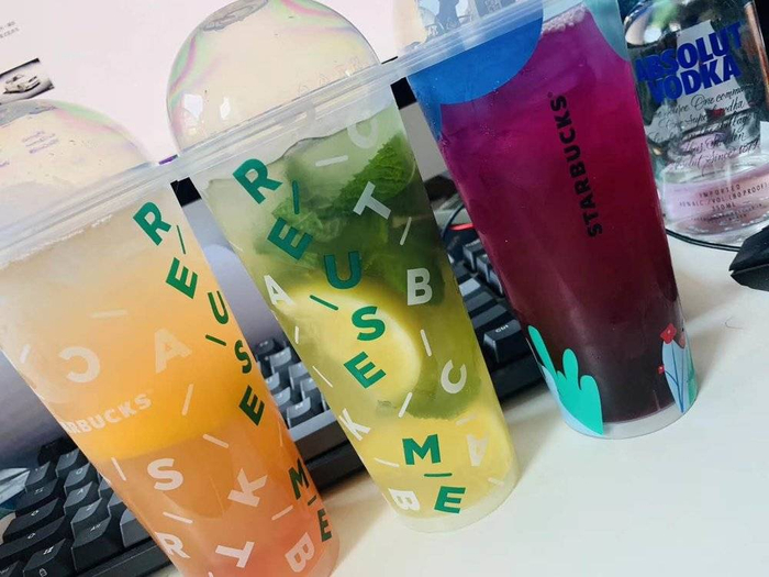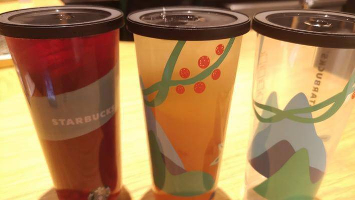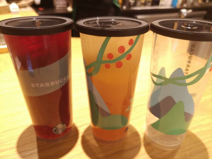 这套杯子不同于星巴克提供的一般的塑料杯,而是一款可重复使用20次的杯子,材质的硬度、手感都介于一次性杯子和星巴克经典的吸管杯之间,搭配上简易黑色杯盖,十分得人心。它不能盛热水,可以说这款杯子是专门为“冷饮”而生。