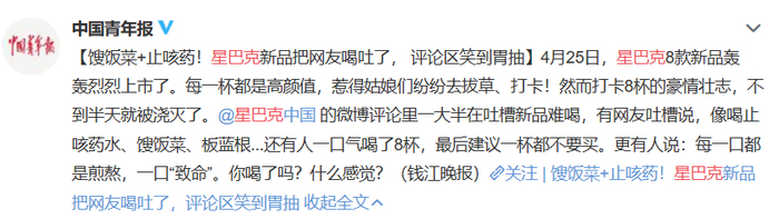 还有用“止咳药水”“板蓝根”来形容星巴克新品的口味的——