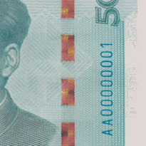 正面中部面额数字调整为光彩光变面额数字“50”,左下角光变油墨面额数字调整为胶印对印图案,右侧增加动感光变镂空开窗安全线和竖号码。